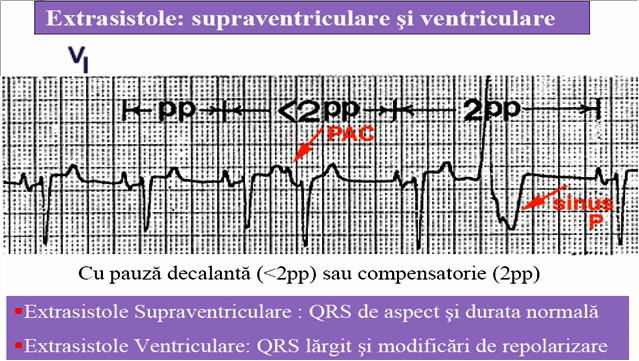 De cele mai multe ori pauza postextrasistolică este compensatorie-suma intervalelor pre- şi postextrasistolice este egală cu dublul intervalului R-R al ritmului de bază. ESV pot fi nesistematizate sau sistematizate.Dintre cele sistematizate, frecvent se întâlneşte bigeminismul (fiecare sistolă normală este urmată de o ESV) – în intoxicaţia digitalică, de exemplu.